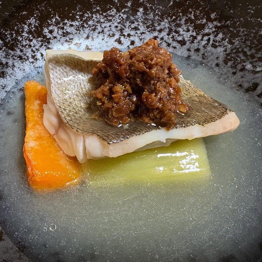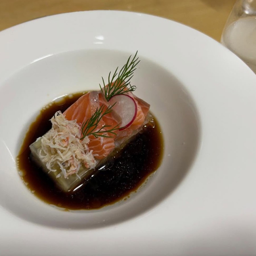 サーモンとカニに、地元農家・佐藤さんの長ネギの香りが重なり、思わずうなるほどのペアリング。