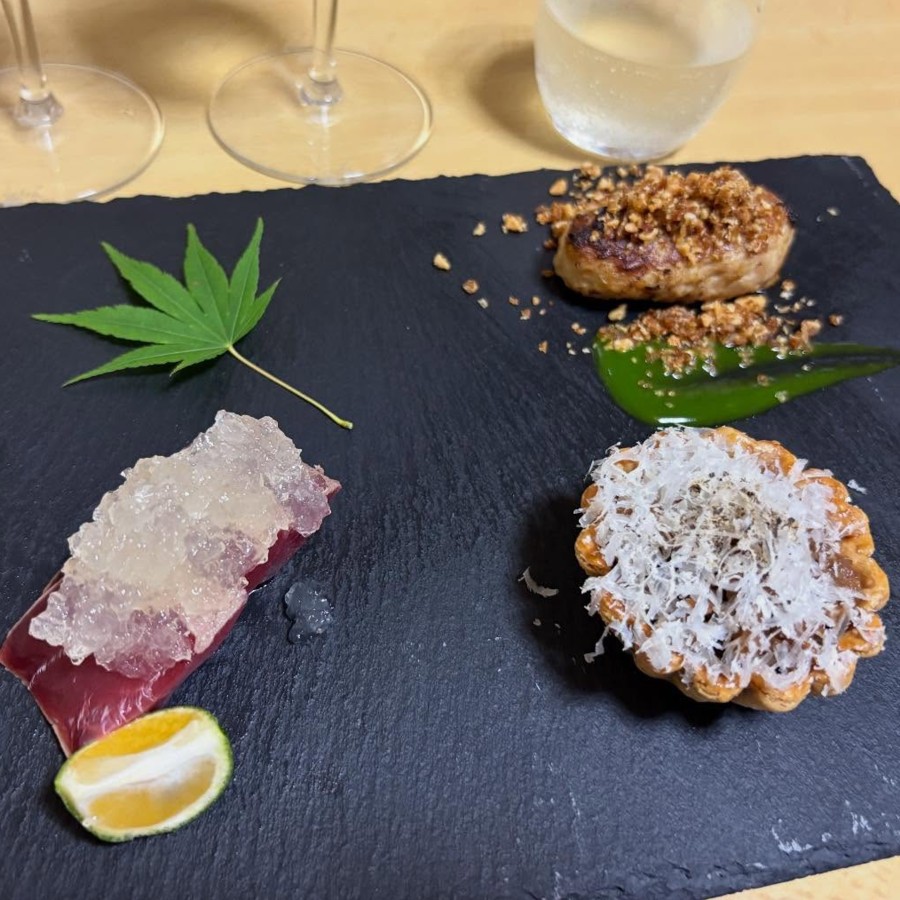 今回のコースは、一皿ごとに美しさと驚きがあり、どのお料理も岩清水との相性が抜群でした。